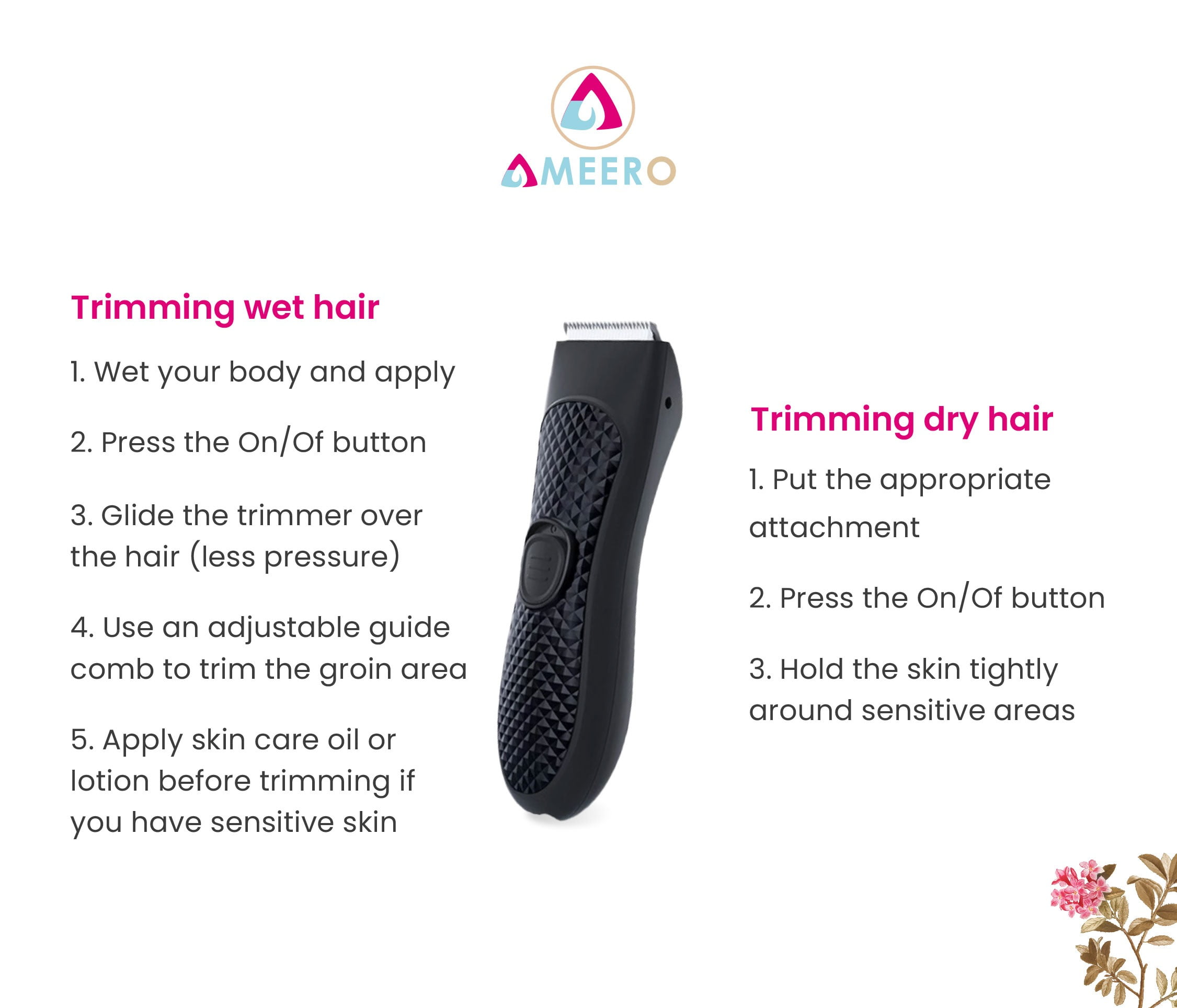 Ameero hair trimmer easily removes hair while gliding on your skin smoothly with no irritation and blood spots left behind.