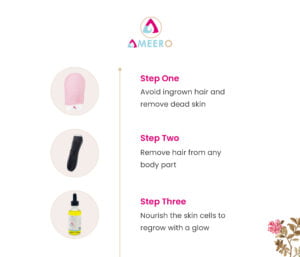 With our perfect body care routine combo you’ll remove dead skin with our exfoliating gloves, remove hair easily with this marvelous hair trimmer, and have smooth nourished skin with a glowy finish with Ameero jojoba oil.